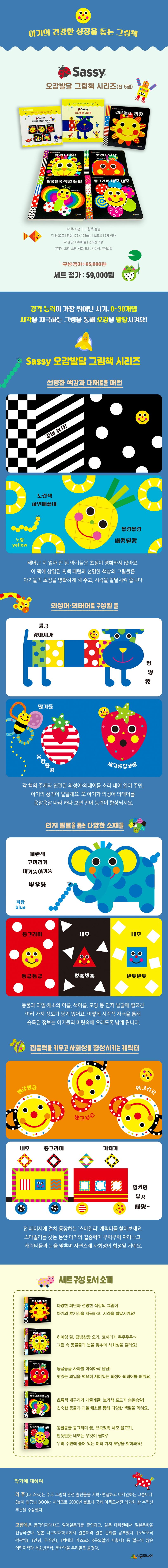 〈Sassy 오감발달 그림책〉은 시각적 자극을 통해 아기의 오감을 빠짐없이 발달시켜 주는 책입니다. 하양과 검정, 빨강 등 대비가 선명한 색상과 좌우 대칭을 이루는 캐릭터, 다양한 패턴 들은 아기들의 시선을 이끌어, 집중력을 키워 주는 동시에 눈의 초점도 명확하게 만들어 줍니다. 동물과 과일 그림을 보며 색이름을 영어로도 익힐 수 있어요. 사물을 형태로 먼저 인식하는 아기들을 위해, 사물의 형태를 동그라미 세모 네모로 분류해 보여 주기도 합니다.