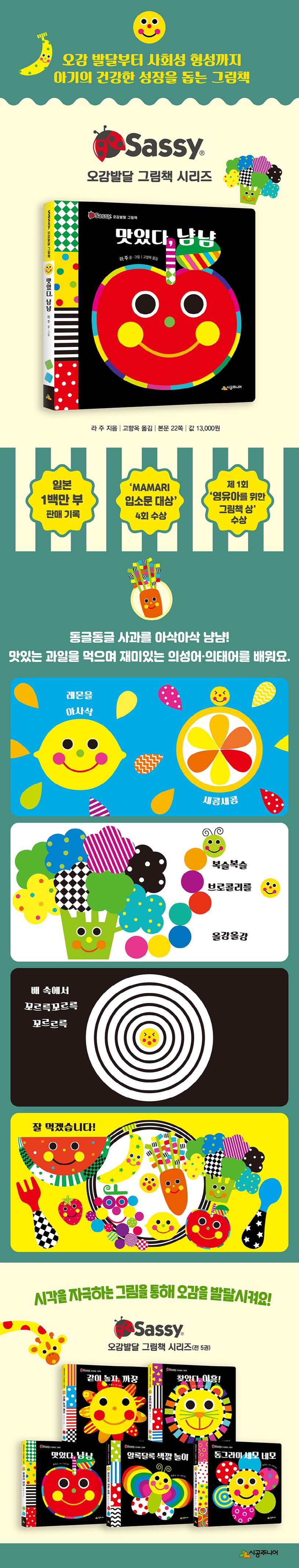 과일과 채소는 아기들에게 친근한 소재입니다. 먹는 소리를 의성어로 표현해, 아직 미각적 경험이 적은 아기들의 식욕을 자극합니다. 책을 보여 주고, 그림 속 과일과 채소를 먹게 해 주면 음식을 잘 먹는 건강한 아기로 자라날 거예요.