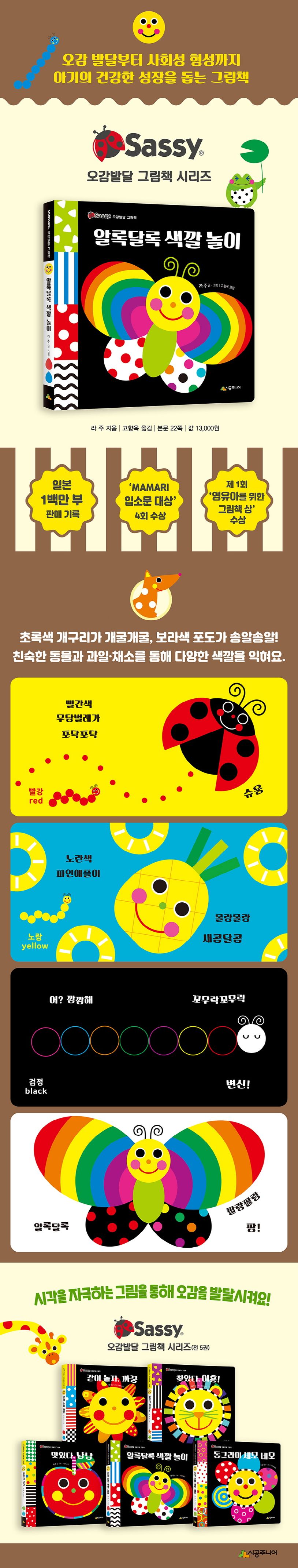 선명한 색채와 다양한 모양은 아기들의 시선을 이끌어요. 아기가 좋아하는 동물과 과일을 통해 색이름을 익히고, 색에 대한 취향도 길러요. 검정, 하양, 주황, 노랑 등 색이름이 한글과 영어로 병기되어 있어, 함께 익힐 수 있어요.