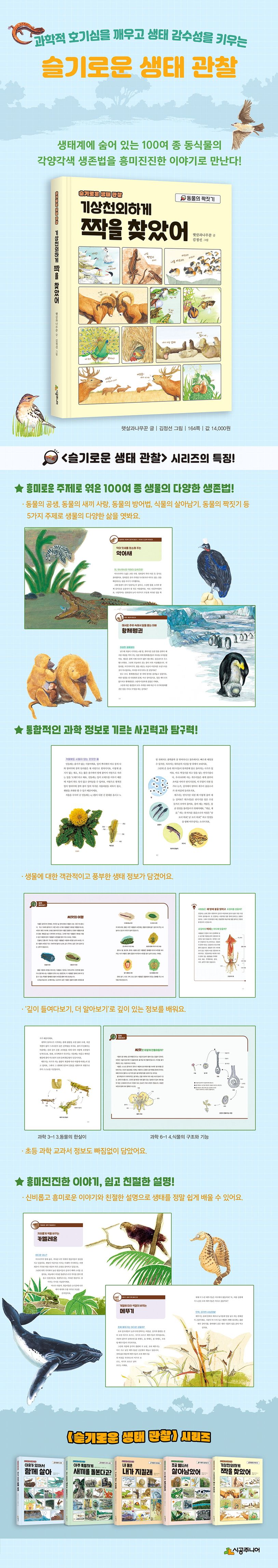 〈슬기로운 생태 관찰〉은 다양한 동식물의 세계를 아이들의 눈높이에 맞게 보여 주는 흥미로운 시리즈이다. 생태계의 전체적인 모습이나 동식물을 종류별로 설명한 책들과는 달리, ‘동물의 공생, 동물의 새끼 사랑, 동물의 방어법, 식물의 살아남기, 동물의 짝짓기’라는 다섯 가지 주제로 보다 깊이 있고 흥미롭게 동식물의 생태 정보를 전하고 있다.
