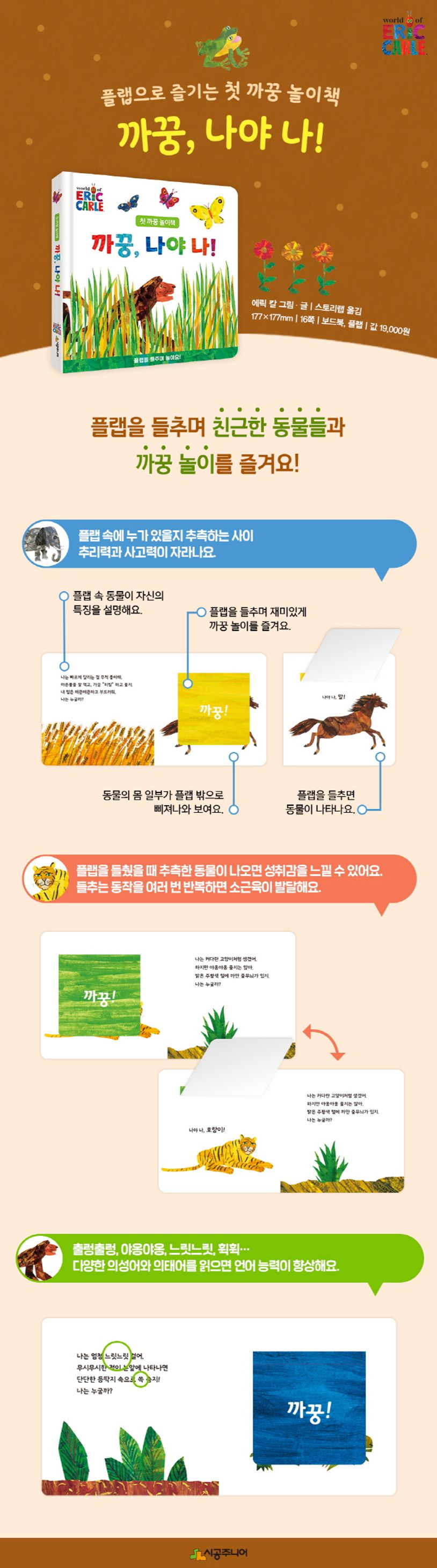 플랩에 가려진 동물이 자신에 대해 설명하며 ‘나는 누굴까?’ 하고 물어요. 플랩 밖으로는 발, 꼬리 등 동물의 몸 일부가 삐져나와 보이지요. 설명과 그림에 담긴 정보를 토대로 플랩 속 동물이 누구일지 아이와 함께 알아맞혀 보세요. 그런 다음 “까꿍!” 외치며 플랩을 열어 동물을 확인하고, “나야 나, 호랑이!” 하며 재미있게 이름을 말해 보세요. 동물을 떠올리는 과정에서 추리력과 사고력이 자라나고, 플랩 속 동물을 맞히며 성취감도 느낄 수 있어요. 동물의 모습을 자세히 관찰하고 동물에 대한 정보도 자연스럽게 배울 수 있답니다.