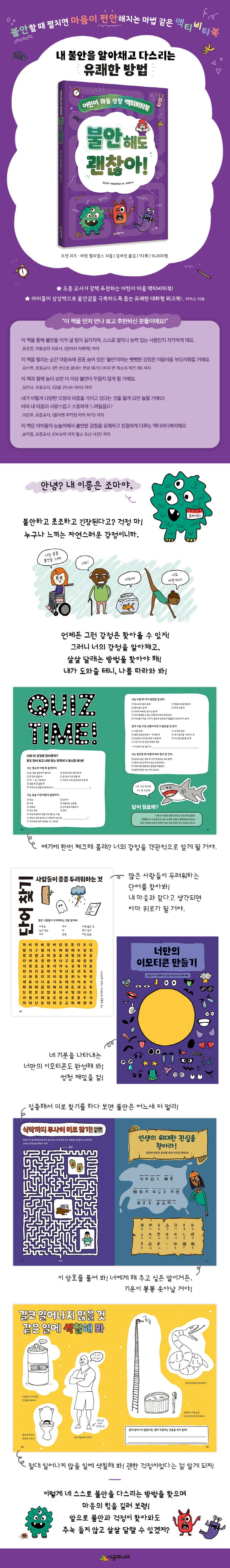 《불안해도 괜찮아!》는 불안이라는 감정에 무겁지도, 그렇다고 너무 가볍지도 않게 접근하는 액티비티북이다. ‘조마’라는 이름의 귀여운 불안 몬스터가 등장해 불안이라는 주제를 유머러스하게 다룬다. 체크리스트를 통해 자신의 불안을 객관적으로 인식할 수 있는 기회를 제공하고, 미로 찾기, 컬러링, 그리기, 게임, 퍼즐 등 다양한 놀이를 통해 스스로 불안을 다룰 수 있는 방법을 찾게 한다.