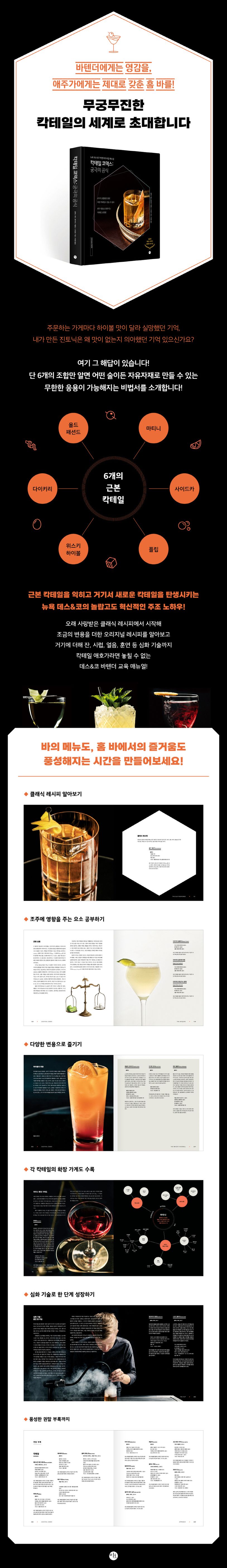 칵테일 열풍을 주도한 뉴욕의 바 데스&코. 세계적으로 많은 팬을 갖고 있고 뉴욕을 여행할 때 꼭 들러야 할 곳 리스트에서 절대 빠지지 않는 이 바의 비결은 뭘까? 이곳의 오너 바텐더 알렉스 데이와 데이비드 카플란이 그들의 20년 노하우을 한 권으로 정리했다. 어떻게 하면 재료의 맛을 조화롭게 어우를 수 있을지 늘 연구하고 논의하는 그들의 결론은, 모든 칵테일은 결국 6가지 조합법으로 정리된다는 것! 올드 패션드, 마티니, 다이키리, 사이드카, 위스키 하이볼, 플립 6가지 칵테일을 중심으로 이야기를 풀어나가며, 스스로 오리지널 칵테일을 만들 수 있는 길로 인도한다.