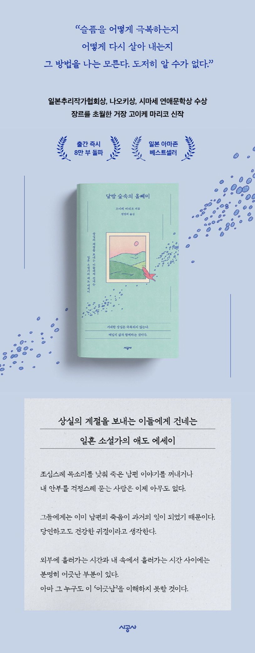 배우자의 죽음 후 상실의 한가운데서 고이케 마리코는 책의 바탕이 된 연재를 수락했다. 한 치의 오차도 없이 흘러가는 바깥의 시간과 자신 내부에 고여 있는 시간의 간극을 감각하며, 무수히 피어오르는 슬픔을 글로 비춰 냈다. 일흔의 소설가는 좀처럼 공감이나 위로를 이야기하지 않는다. 거대한 상실은 극복될 수 없고, 이로 인한 세상과 나의 ‘어긋남’은 사는 동안 계속되리라는, 더없이 솔직한 독백만이 남는다.