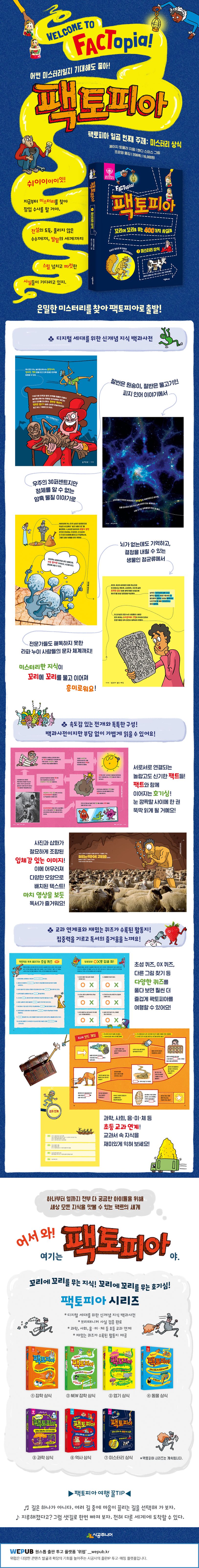 〈팩토피아〉에서는 동물과 식물, 스포츠, 역사, 엽기, 과학 등 흥미로운 400가지 사실들이 점선 길을 따라 이어진다. 사진과 삽화가 절묘하게 조합된 통통 튀는 이미지, ‘예상치 못한’ 사실들은 읽는 내내 즐거움을 선사한다. 무엇보다 오랜 역사와 권위를 자랑하는 브리태니커의 검증을 거쳤다는 점, 초등 교과와 연계된 내용이 담겼다는 점에서 믿을 만하다. 점선 길을 따라 눈이 가는 대로 읽어도 좋고, 샛길을 따라 모험하듯 읽어도 좋다. 각 권마다 제공되는 워크북으로 다양한 유형의 퀴즈를 풀다 보면 집중력과 이해력이 높아진다. 읽는 재미, 보는 재미, 상상하는 재미에 답을 맞히는 재미까지 더하며 적극적인 독서를 끌어내는 것이 이 책의 가장 큰 장점이다.