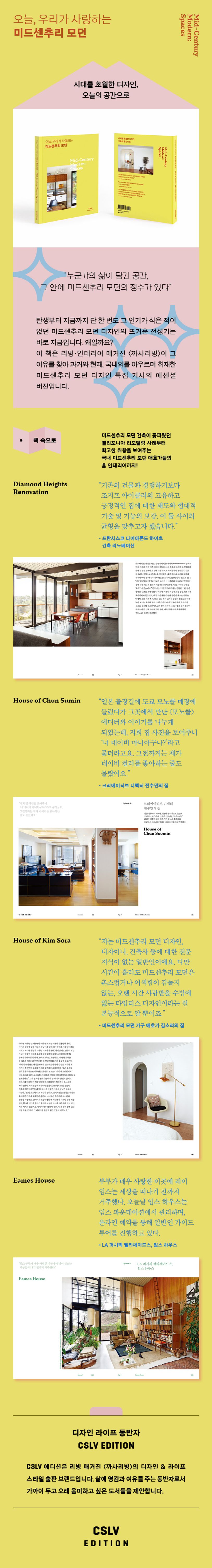 20세기 중반 탄생하여 디자인계의 영원한 클래식으로 남은 ‘미드센추리 모던’. 이 디자인은 그 가치가 오늘날의 맥락에서 재탐색되며 이제까지와는 또 다른 국면의 뜨거운 전성시대를 맞이하고 있다. 국내외 미드센추리 모던 애호가들의 공간과 그 안의 이야기에 집중한 이 책은 사람과 그의 삶에 중심을 내어주는 미드센추리 모던 디자인의 정수를 충실하게 담아낸다.