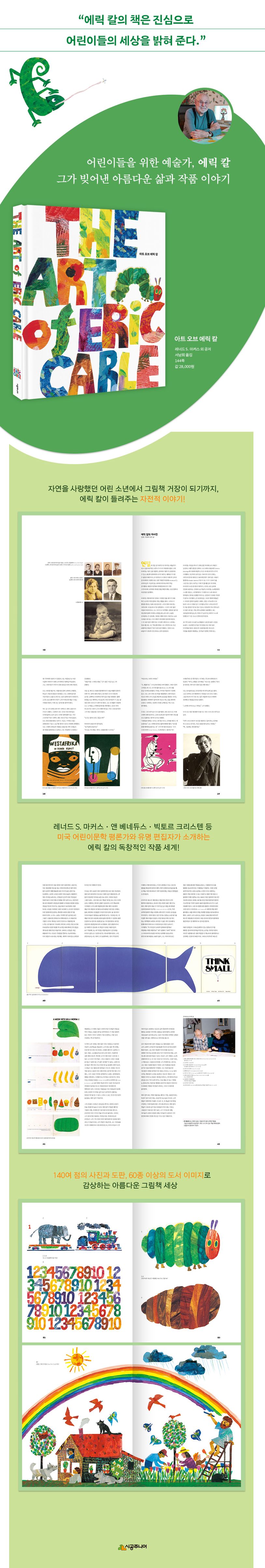 살아생전 그가 남긴 70여 종의 작품 중, 60종 이상의 도서 이미지(표지 및 본문)들과 목록들이 이 책에 함께 수록되어 있다. 흰 면을 가득 채우고 있는 그의 아름다운 그림들을 감상하다 보면 마치 미국 매사추세츠주에 있는 ‘에릭 칼 그림책 예술 박물관’에 와 있는 듯한 착각에 빠지게 된다. 또한 칼이 자신만의 콜라주 기법으로 그림을 완성해 나가는 과정을 사진으로 기록한 자료와 그의 추상 미술 실험 작품들까지 함께 수록되어 있어 마지막 책장을 덮기까지 독자에게 풍성한 볼거리를 제공한다.