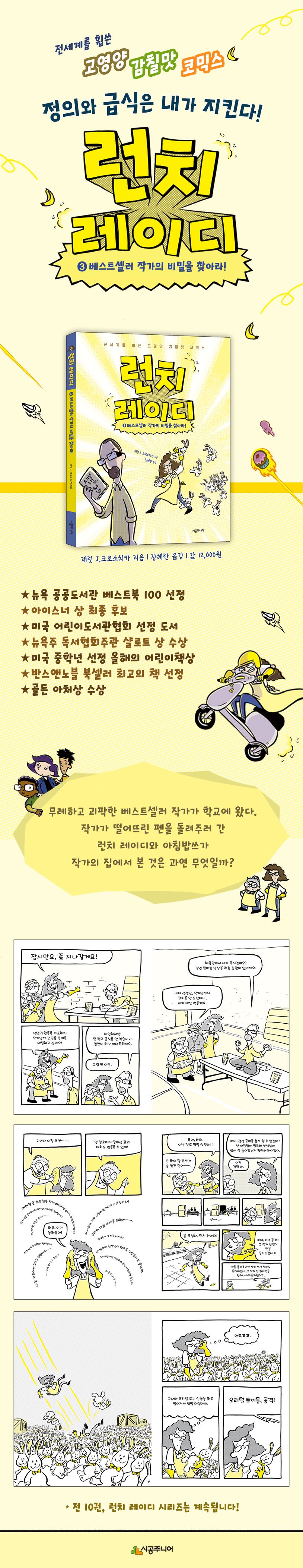 뉴욕타임스 베스트셀러 작가로 선정된 작가 재럿 J. 크로소치카가 유머러스한 이야기와 발랄한 노란색으로 포인트를 준 그림으로 새로운 액션 히어로물 〈런치 레이디〉를 만들어 냈다. 단, 이 시리즈에서 우리가 만날 슈퍼 영웅은 구릿빛 피부의 울룩불룩 근육맨이거나, 돈이 많은 부자거나, 혹은 외계에서 온 초능력자가 아니다. 주변에서 흔히 만날 수 있는 아줌마, 그것도 학교에서 급식을 책임지는 영양사 선생님이다. 평범하기 그지없는 학교 영양사 선생님이 사실은 도시의 악당을 물리치는 슈퍼 영웅이었다니!