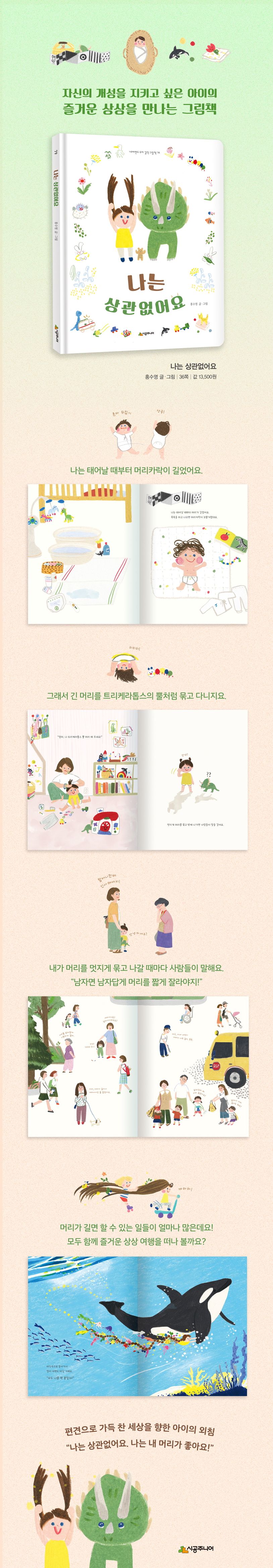아이는 태어날 때부터 머리가 길었어요. 머리를 올려 묶으면 마치 트리케라톱스 뿔처럼 보여서, 아이는 자신의 긴 머리카락을 좋아해요. 그런데 멋지게 머리를 묶고 밖으로 나가면 만나는 사람마다 아이에게 한마디씩 해요. 경비 아저씨는 “에구, 사내 녀석이 머리가 너무 길어.” 하며 혀를 차고, 같은 아파트에 사는 동생도 “남자인데 왜 머리 묶었어요?”라고 물어요. 아이는 머리가 길다는 이유로 남자답지 못하다는 말을 듣고, 여자아이로 오해를 받지요.