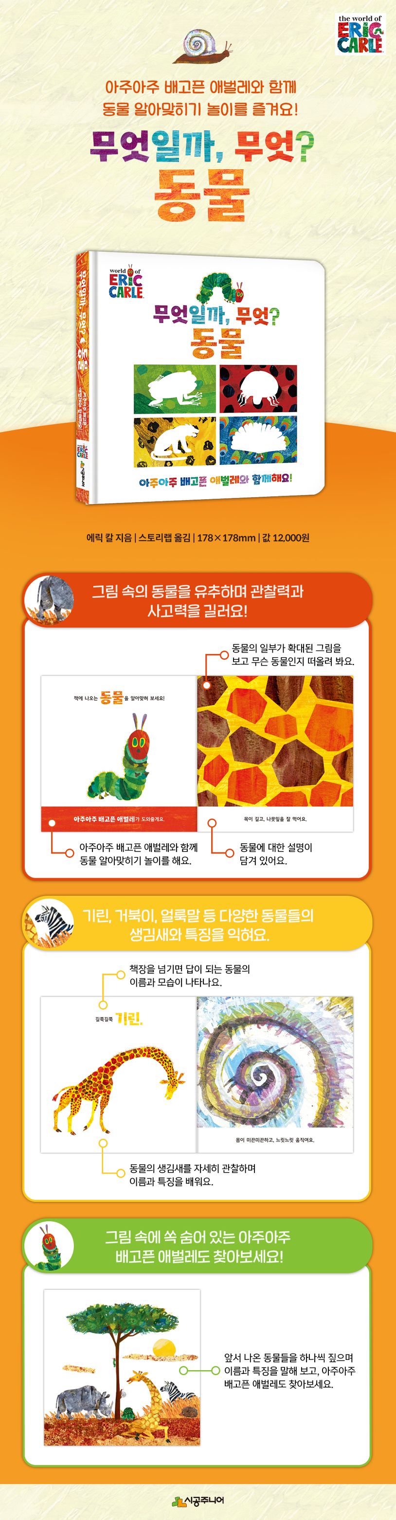 장면마다 담긴 동물의 부분 그림과 설명을 보고, 아주아주 배고픈 애벌레와 함께 무슨 동물인지 알아맞히며 논다. 부분을 보고 전체를 유추하며 관찰력과 사고력을 기르고, 동물에 관한 정보를 배울 수 있다. 에릭 칼 특유의 종이 콜라주로 생생하게 표현된 동물 그림이 아이의 호기심을 자극하고 미적 감수성을 길러 준다.