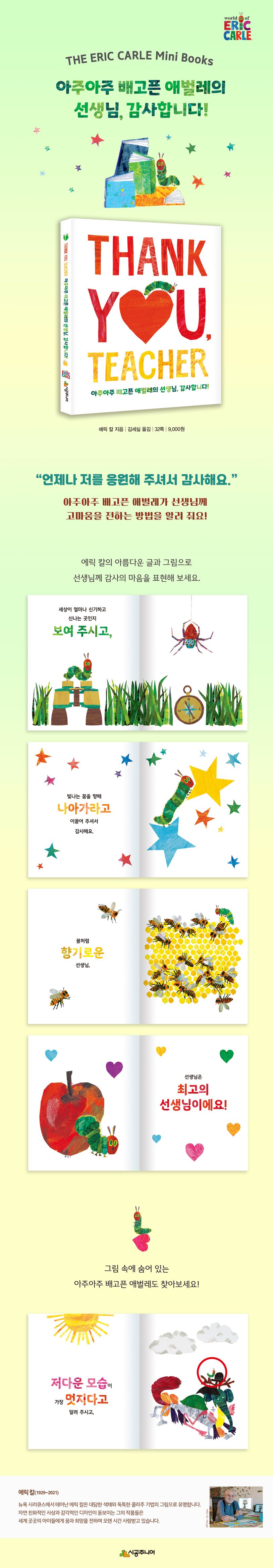 우리는 어린이집부터 시작해, 학교, 학원 등에서 많은 선생님들과 만나요. 그리고 살아가면서 우리에게 조언이나 위로를 해 주는 사람 역시 선생님이라고 할 수 있어요. 하지만 선생님들께 감사한 마음을 표현하기란 쉽지 않아요. 이 책을 통해 아주아주 배고픈 애벌레가 들려주는 “절대로 포기하지 말라고 말씀해 주셔서 감사해요.”, “선생님은 최고의 선생님이에요!”처럼 진심이 담긴 감사의 말들로 선생님께 마음을 전해 보세요. 또한 다양한 동물, 사물, 과일 등 밝고 화사한 색감의 콜라주 그림들은 보는 즐거움까지 주지요. 책의 앞쪽에는 ‘받는 사람, 보내는 사람’을 쓸 수 있는 공간이 있어, 고마움을 전하고 싶은 선생님의 성함을 적어 선물할 수 있어요.