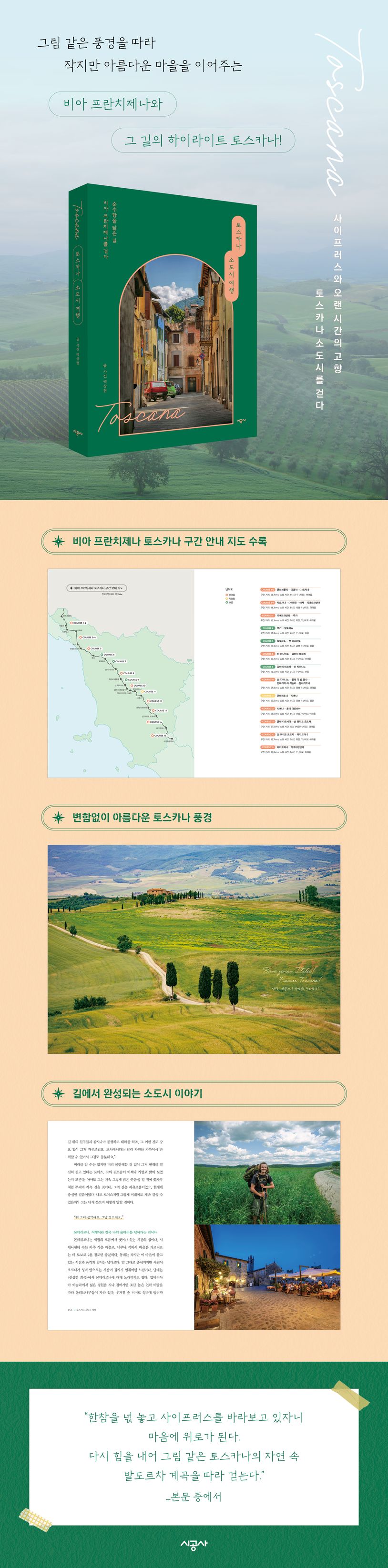 이탈리아 트레킹 여행을 꿈꾸는 사람이라면, 또는 여행의 새로운 매력을 찾고자 하는 사람이라면 주목해야 하는 떠오르는 여행지 토스카나! 영국 런던에서부터 이탈리아 로마까지 이어지는 순례길인 ‘비아 프란치제나’는 스페인 산티아고 순례길 못지않게 아름다운 풍경을 자랑한다. 특히 비아 프란치제나의 한 구간을 차지하는 토스카나 지역은 맛의 천국이자 최고급 와인의 산지이며, 순례길에 지친 여행자들의 쉼터가 되어주는 치유의 공간이다. 《토스카나 소도시 여행》은 이탈리아 토스카나와 그 주변 소도시 24곳의 다채로운 매력을 소개한다. 책의 목차를 지도 삼아 그 여정을 따라가다 보면 어느새 토스카나에 푹 빠져 있는 자신을 발견할 것이다. 현지 구석구석을 느끼고 경험하는 여행을 꿈꾸는 이들에게 유용할 것이다.