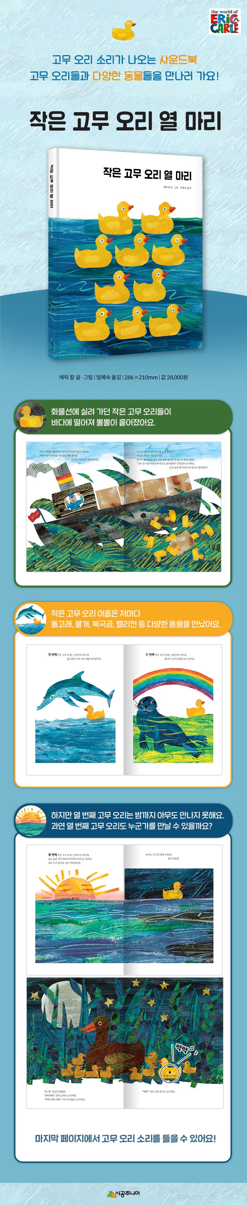 공장에서 만들어진 작은 고무 오리들이 상자에 담겨 화물선에 실려 가는데, 갑자기 폭풍이 몰아쳐요. 상자 하나가 파도에 휩쓸리고, 작은 고무 오리 열 마리가 바다에 떨어지지요. 작은 고무 오리들은 바닷물을 타고 이리저리 흩어져 돌고래, 물개, 북극곰, 펠리컨 등 저마다 다른 동물들을 만나요. 하지만 열 번째 작은 고무 오리는 밤이 올 때까지 홀로 넓고 넓은 바다에서 물과 하늘만 바라볼 뿐이에요. 열 번째 작은 고무 오리도 누군가를 만날 수 있을까요? 그림 속 버튼을 눌러 “꽥꽥” 귀여운 소리를 들으며 세계 곳곳을 여행하는 작은 고무 오리들의 이야기를 만나 보세요.