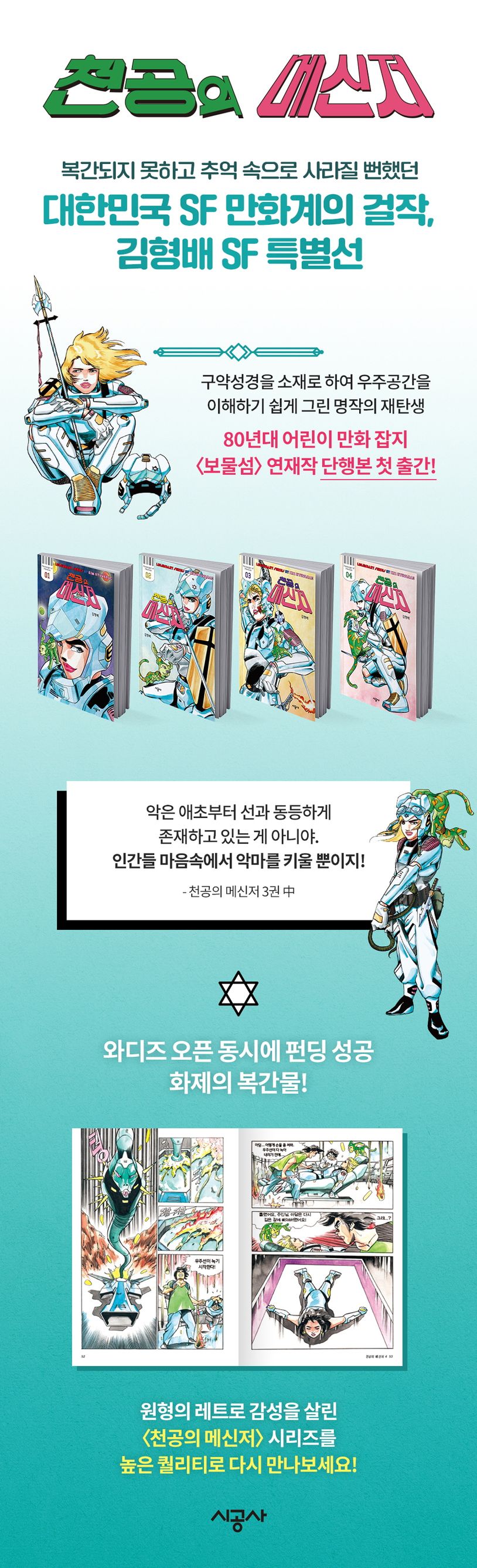 1986~88년 어린이 만화 잡지 〈보물섬〉에서 연재한 SF 판타지물. 구약성경을 소재로 하여 우주공간을 그린 명작 〈천공의 메신저〉 시리즈가 37년 만에 단행본으로 첫 출간했습니다(전 4권).