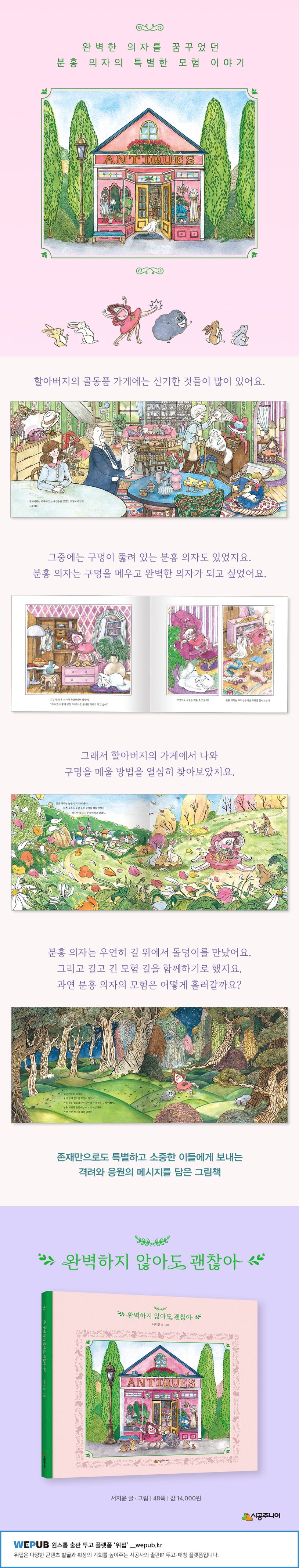 할아버지의 골동품 가게에는 신기한 것들이 많이 있어요. 그중에는 동그랗게 구멍이 뚫린 분홍 의자도 있지요. 사람들은 분홍 의자를 보며 말했어요. “저 구멍만 아니면 완벽했을 텐데!” 그날 밤 속상해하던 분홍 의자는 완벽한 의자가 되기 위해 가게를 나와 긴 모험을 떠났어요. 분홍 의자는 예쁜 꽃과 나뭇잎들로 구멍을 메워 보았지만 마음처럼 쉽지 않았어요. 잔뜩 화가 난 분홍 의자 앞에 곤경에 처한 돌덩이 친구가 나타났지 뭐예요. 분홍 의자는 있는 힘을 다해 돌덩이를 구해 주었고, 돌덩이는 그런 분홍 의자의 구멍을 메울 방법을 함께 찾아 주기로 했지요. 과연 분홍 의자는 바라는 대로 완벽한 의자가 될 수 있을까요?