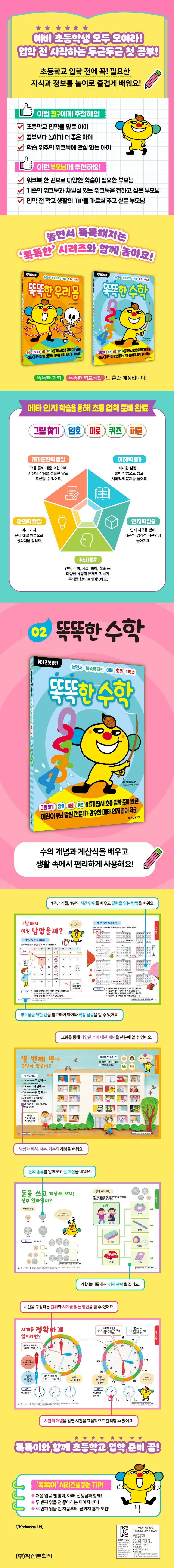 ‘똑똑한’ 시리즈는 이와 같은 고민을 해결하기 위해 기획된 워크북으로, ‘학습’이 아닌 ‘놀이’로 아이와 즐겁게 초등학교 입학 전 필요한 지식과 정보를 습득할 수 있습니다. 또한 교과 과정이 반영된 ‘똑똑한’ 시리즈를 미리 접함으로써 아이가 낯선 학교생활에 빨리 적응하여 자존감 높은 생활을 할 수 있도록 도움을 줍니다.