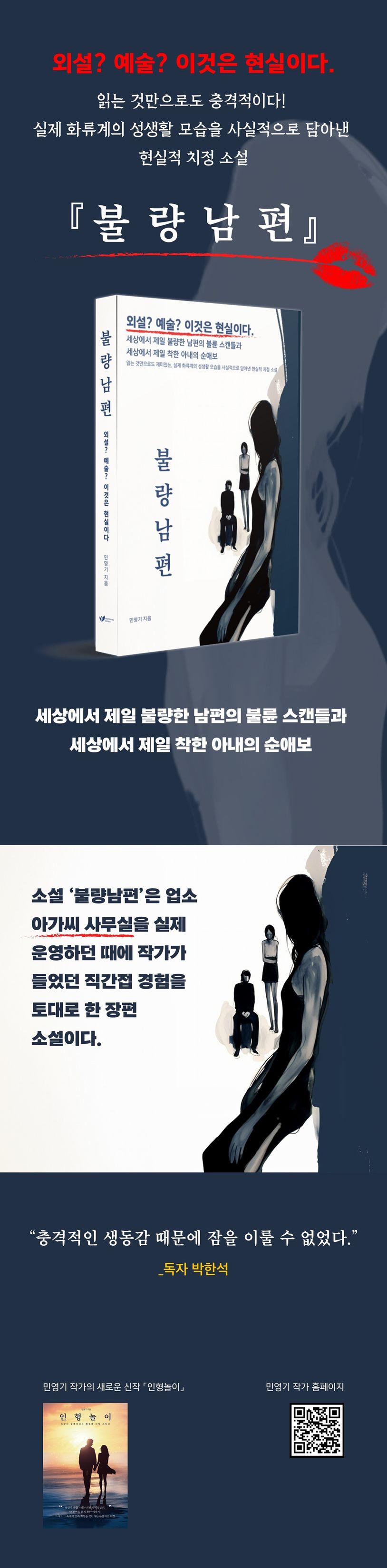 남부럽지 않은 모습을 가진 부부에게도 숨겨진 뒷 이야기가 있다. 예쁜 아내와 귀어운 딸까지 번듯하게 성공한 가정을 지닌듯한 남편 영찬, 하지만 그 실체는 누구보다 문란한 불량남편이였다? 세상에서 제일 불량한 남편과, 세상에서 제일 착한 아내의 순애보… 룸살롱을 배경으로 벌어지는, 너무나도 현실적인 민영기의 소설 ‘불량남편'을 지금 만나보자.