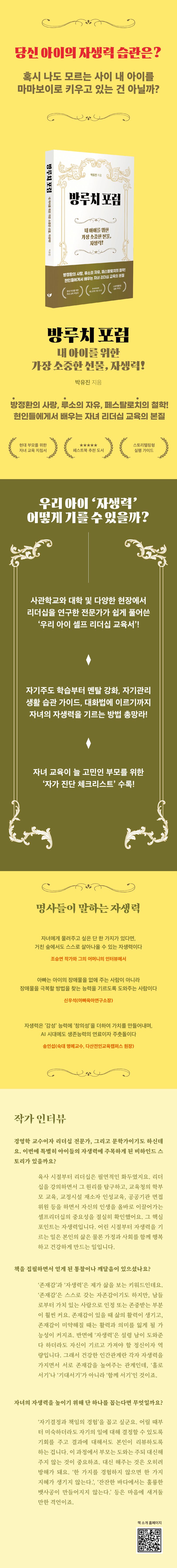 오랜 기간 리더십 연구와 교육 전문가로서 신뢰감 있는 이력을 가진 작가는 이 책을 통해 부모와 아이 모두가 자생력을 기르기 위해 무엇을 해야 하는지를 구체적이고 생생하게 전달한다. 포럼의 이야기는 독자들에게 단순한 정보 이상의 영감을 제공하며 부모와 자녀 모두에게 변화의 동기를 부여한다. 자녀가 독립적이고 창의적이며 자기 삶의 주도적인 존재로 자라기를 원하는 부모에게 이 책은 실질적으로 활용할 수 있는 친절한 가이드북이 될 것이다.