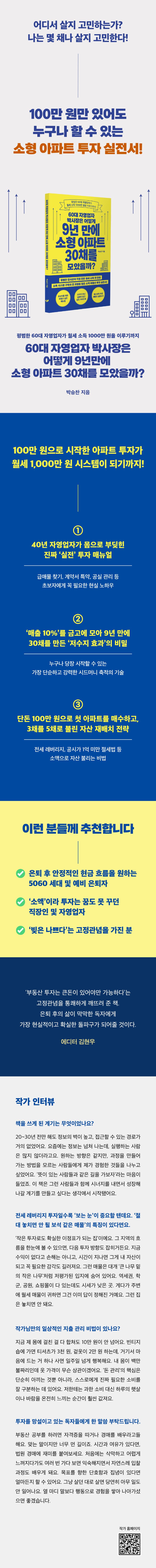 『60대 자영업자 박사장은 어떻게 9년 만에 소형 아파트 30채를 모았을까?』는 평범한 장사꾼이 직접 부딪혀 만든 월세 1,000만 원 시스템의 모든 과정을 담은 소액 부동산 투자 실전서다. 저자는 주방용품 가게를 40년간 운영해온 60대 자영업자로, 어느 날 문득 노후를 걱정하다가 ‘매출의 10%를 매일 금고에 넣는 것’에서 시작해 투자 자금을 만들었다. 그렇게 모은 자금으로 소형 아파트를 매수하고, 임대 수익을 다시 적금으로 불리며 물건을 늘려간 9년간의 기록이 고스란히 담겼다.