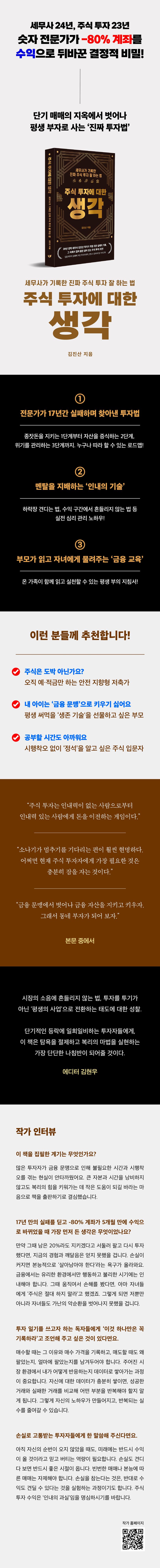 『주식투자에대한생각』은숫자를다루는데능숙한24년차세무사조차시장앞에서는얼마나무력했는지를고백하는,가장처절하고도솔직한‘실패의인문학’이다.저자는17년이라는긴시간동안욕심과본능에휘둘리며겪어야했던시행착오와,코로나19팬데믹당시계좌가-80%까지곤두박질치는공포의순간을가감없이복기한다.그리고그절망의끝에서도망치는대신‘원칙’과‘기다림’이라는투자의본질을붙잡아극적인반전을이뤄낸다.이책은단순히수익률을높이는기술을나열하는실용서가아니다.시장의소음에흔들리지않고자신의그릇을키우는법,그리고투기를멈추고투자를‘평생의사업’으로전환하는태도에관한묵직한성찰이다.단기적인등락에일희일비하며길을잃은투자자들에게,이책은탐욕을절제하고원금을지키며복리의마법을실현하는가장단단한나침반이되어줄것이다.-페스트북편집부책속에서20여년간주식투자를하면서느낀다양한경험과생각,마음을2020년중순부터글로남기기시작했다.마치일기처럼.처음에는온전히나를위한글로시작했다.그런데글을쓰면서이러한경험을자녀에게전해주고싶은생각이들었다.나와가족을위한글이목적이었다.그런데굳이가족을위한글로한정할필요는없겠다는생각이들었다.가족을위한글이라면다른사람들에게도충분히도움이될수있을것같았다.이것이『주식투자에대한생각』이세상에나오게된이유다.-p.5주식을샀으면산사실을잊어라.그리고자신의일에집중해라.자신의삶에집중해라.그러면자산이,시간이,갈수록커진다.바로여기에주식투자의묘미가있다.주식투자에서부지런하고성실한태도는도움이되지않는다.그에너지와열정을자신의삶에집중하고주식투자에서는개미보다베짱이가되는것이좋다.-p.52버는투자보다잃지않는투자를권한다.필자도많은손실을본상태에서멘탈이완전히붕괴되었고모아온주식을시장에헐값에갖다버렸다.그런행위들을반복했다.그러다가코로나가터지면서똑같은일이반복될처지였다.본전은꿈과같은목표였다.잃지않으려고'파는행위'를하지않았다.-p.91주식투자는평생투자이다.빨리간다고더멀리가는것이아니다.효율을올린다고시간을재촉하는투자는후회를낳기가쉽다.금융에서는부지런함이때때로치명적인약점이되기도한다.충분한검토속에이루어진투자는쉽게바뀌지않기때문에무척중요하다.-p.151그렇다면언제진입해야손실은최소화하고이익은극대화를할수가있는가?좋은주식임에도불구하고만인이그주식을내다버릴때가기회다.대부분의주식은저평가구간을거치게되어있다.다만인내가부족해서그때를기다려사지못하고,실제로저평가구간에접어든시기에는심리상태가무너져서헐값으로시장에내던지고만다.-p.239주식투자일기를남긴것은아빠와같은실수를반복하지않도록자녀들에게기록을남기고싶어서였습니다.그런데시간이지나다시읽어보니그것이저에게도큰도움이되더군요.그러다보니‘가족만볼것이아니라다른투자자들에게도도움이될수있지않을까?’라는생각이들었습니다.무엇보다많은투자자가금융문맹으로인해불필요한시간과시행착오를겪는현실이안타까웠어요.-작가인터뷰돈은주인이어떤태도를취하느냐에따라친구를더많이데려오기도하고,때로는주인에게서떠나기도합니다.주인이돈을존중하고,더커질수있도록대우하면그에맞게따라주고,무리지어다니기도합니다.반대로함부로대하면주인에게등을돌립니다.그래서돈은소중하게다뤄야하며,없으면불편함을느낄정도로만소비합니다.그렇게하면돈스스로도잘자랍니다.-작가인터뷰과거의저는손실때문에짜증과화가나저가에주식을팔아버린적이많습니다.그런데시간이흐르고보면,그주식중상당수가몇배씩오른경우가많았습니다.시장과내가같은방향이아닐때가많다는것을깨달았죠.아직자신의순번이오지않았을때도,미래에는반드시수익이올것이라고믿고버티는역량이필요합니다.시장에서끝까지버티세요.투자할때의마음가짐을잊지말고,손실도견디다보면반드시좋은시절이옵니다.-작가인터뷰