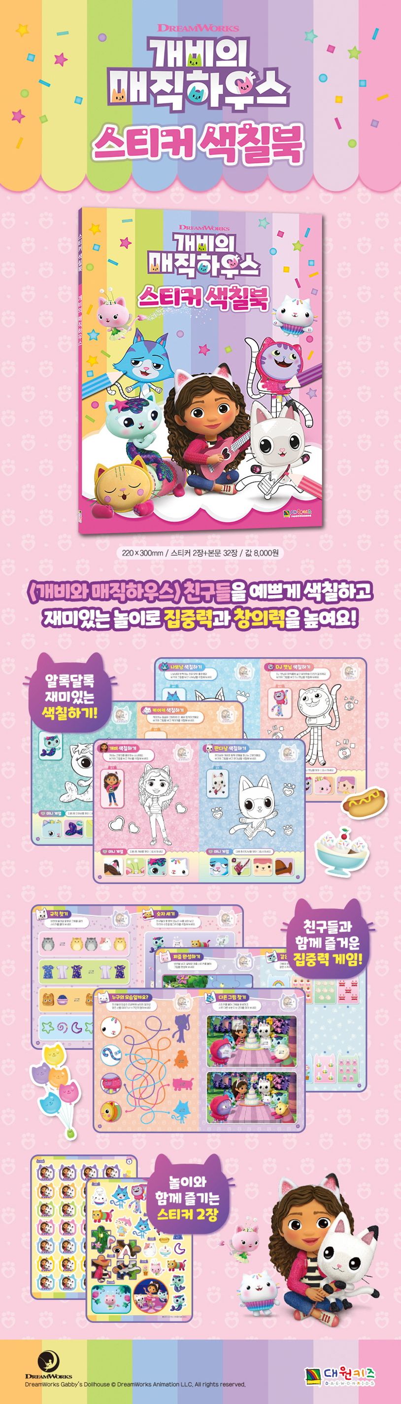 〈개비의 매직하우스〉의 귀여운 친구들을 자유롭게 색칠하며 창의력과 표현력을 키워 보세요. 다른 그림 찾기, 퍼즐 완성하기, 사다리 타기 등 다양한 게임을 통해 즐겁게 놀이하면 집중력도 UP! UP! 놀이와 함께 즐길 수 있는 스티커도 2장 들어있어 더욱 재미있게 놀이할 수 있답니다!