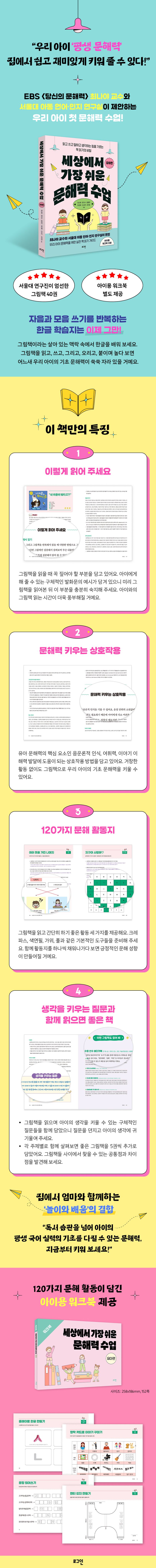 한글학습,아직도자음과모음쓰기를반복하게하고있나요?이제는아이에게재미와배움이함께하는문해력수업을선물할시간입니다!이책은아이가본격적인읽기와쓰기에들어가기전,어떻게문해력의기초를쌓아야하는지구체적이고실천적인방법을안내한다.부모님이아이와함께책을읽고,쓰고,오리고,붙이며단순한공부가아닌놀이와배움을결합하여자연스럽게문해력을다질수있도록했다.문해력을자연스럽게키워가는이과정에서단순한독서습관을넘어아이의평생국어실력의기초를다질수있는문해력향상방법을제공한다.책의주요구성및특징1.서울대연구진이엄선한그림책40권과부모지도안그림책을바탕으로일상속대화,놀이등을활용해아이의문해력을길러주는활동방향을자세하게제시한다.2.120가지문해활동이담긴아이용워크북한글의기초부터문장만들기까지아우르는통합문해활동을아이가직접해볼수있도록아이용워크북을제공한다.3.유아의발달단계에맞춘문해력교육만4~5세아이들이이해할수있는언어,놀이중심의접근법을통해자연스럽게한글을배우고기초문해력을다진다.4.주제별추천그림책5권한권의책에서더넓은독서경험으로자연스럽게확장할수있도록제안한다.