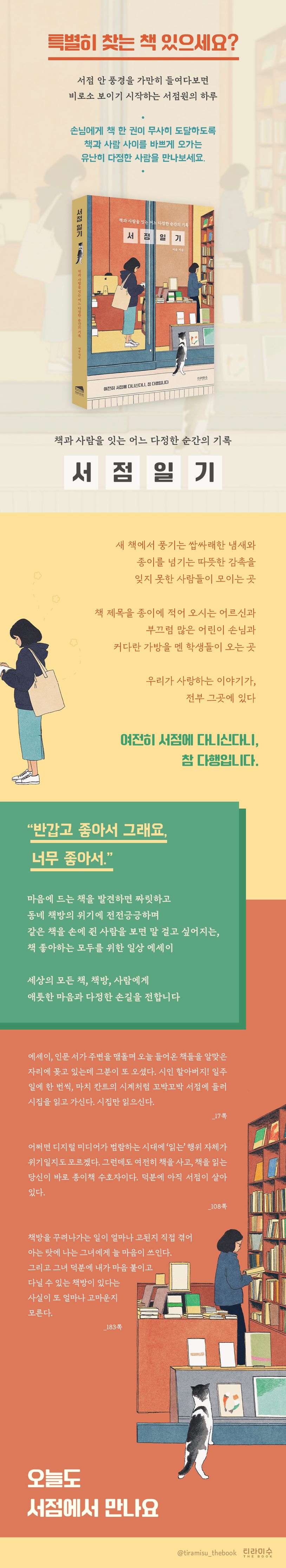 《서점 일기》는 책과 사람을 너무나 사랑한 작가가 마침내 서점에서 일하게 되면서 만난, 잊지 못할 순간에 관한 에세이이다. 서점을 찾는 손님들의 다양한 모습과 보통은 잘 알 수 없는 서점의 속사정, 그리고 작가가 애지중지하고 귀여워하는 책을 둘러싼 모든 것에 관한 이야기를 엮었다. 에피소드를 하나하나 읽다 보면 서점이라는 공간이 단순히 책만을 사고파는 공간이 아니라는 생각에 공감하게 된다. 역시, 우리에게는 여전히 서점이 필요하다.