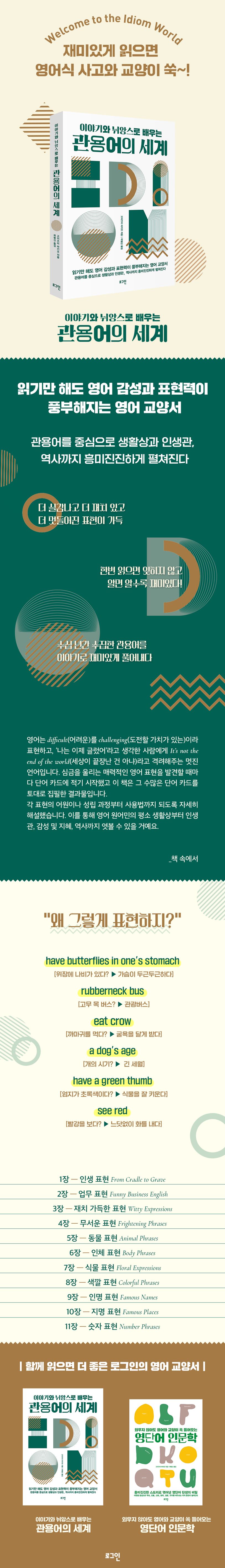 《관용어의 세계》는 영어를 더 가깝고 생생하게 느낄 수 있도록 문을 활짝 열어주는 책이다. 저자는 누구보다 영어를 사랑하는 자칭 영어 ‘덕후’이자 영어표현 연구가 그리고 긴 시간 영어 텍스트를 다뤄온 편집자다. 그런 그가 신기하고 재미있고 때로 충격적이기까지 했던 관용어를 수십 년간 수집했고 왜 그런 표현이 생겨났는지를 톺아보고 정리한 책이 바로 《관용어의 세계》이다. 인생, 업무, 식물, 동물, 인체, 색깔, 숫자 등의 11개 주제에 156개의 관용어를 표제어로 다루는데, 156개에 그치지 않고 유사한 표현이나 정반대 상황에서 쓸 만한 표현, 사용된 단어가 쓰인 짚고 넘어갈 만한 다른 표현까지 갖가지 관용어가 꼬리에 꼬리를 물고 흥미롭게 이어진다. 옆에 앉아 옛 이야기를 해주는 듯한 스토리텔링 덕분에 굳이 외우지 않아도 머릿속에 관용표현이 자연스레 각인된다는 것은 다른 책은 흉내 낼 수 없는 이 책만의 장점이다. 관용어란 오랫동안 사람들의 입에 오르내리며 굳어진 표현이다. 그렇기에 필연적으로 역사와 문화가 바탕이 된다. 그 시작점을 되짚어보고 흥미진진한 이야기로 엮어냈기에 책을 읽는 동안 자연스레 교양이 쌓이는 효과도 누릴 수 있다.