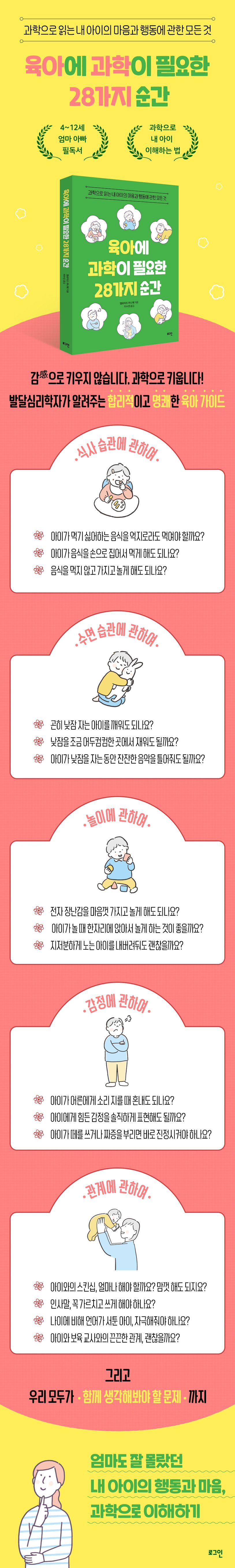 이 책 《육아에 과학이 필요한 28가지 순간》은 아이를 위한 놀이, 수면 문제, 아이의 감정, 아이와의 관계 등 아이를 키우며 마주하는 28가지 고민과 그에 대한 답을 알려주는 자녀교육서다. 과학적 연구 결과와 사례를 바탕으로 아이의 행동이 보여주는 의미를 설명하고, 아이 마음 읽는 법을 설명하고 있다. 아이를 돌보는 엄마 아빠는 물론 아이 발달에 관여하는 모든 사람, 다시 말해 부모가 없는 시간에 아이를 돌보는 보육 교사, 아이에게 조금이라도 영향을 끼치는 일을 하는 모든 분들에게 이 책을 권한다.