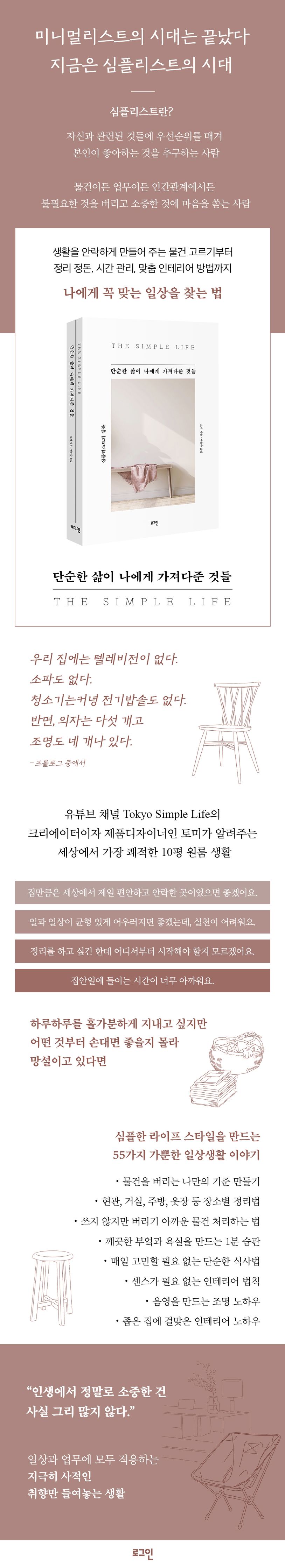 유튜브 크리에이터이자 디자이너인 토미의 단순하지만 안락한 10평 원룸 생활을 보여주는 『단순한 삶이 나에게 가져다준 것들』이 출간됐다. 눈코 뜰 새 없이 바쁜 평일을 보내고 드디어 맞는 토요일 아침, 여전히 무거운 몸을 겨우 일으켰을 때 그제야 시야에 들어오는 잔뜩 쌓인 집안일에 눈을 질끈 감아 본 독자라면 이 책이 정답이 될 수 있다.