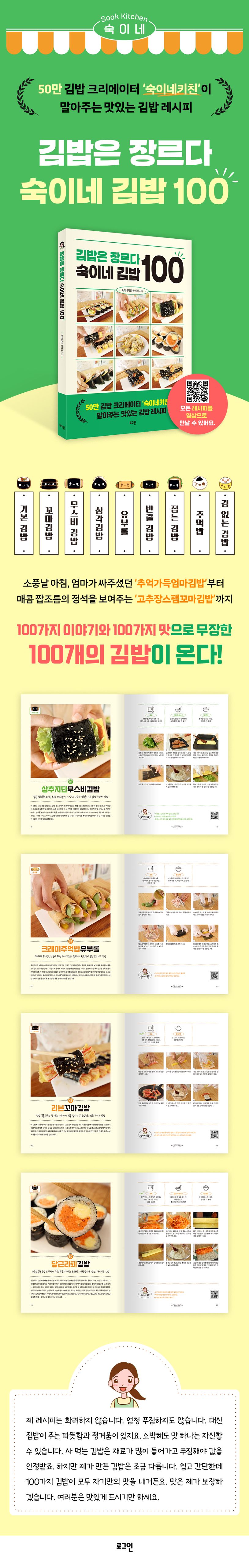 50만 김밥 크리에이터 자타공인 김밥 광인 ‘숙이네키친’의 첫 책이다. 올릴 때마다 폭발적인 조회 수를 기록하며 전국 김밥러버들의 사랑을 받은 100개의 김밥(레시피 영상 QR코드 삽입)을 한 권에 담았다. 김과 밥, 그리고 좋아하는 재료를 넣어 돌돌 말기만 하면 든든하고 맛있는 한 끼로 변신하는 김밥에는 한계가 없다. 그야말로 무한 김밥. 소풍날 아침, 엄마가 정성 들여 싸주신 첫 번째 ‘추억가득엄마김밥’을 시작으로 매콤 짭조름의 정석을 보여주는 100번째 ‘고추장스팸꼬마김밥’까지 100가지 이야기와 100가지 맛으로 가득한 100개의 김밥을 만나보라.