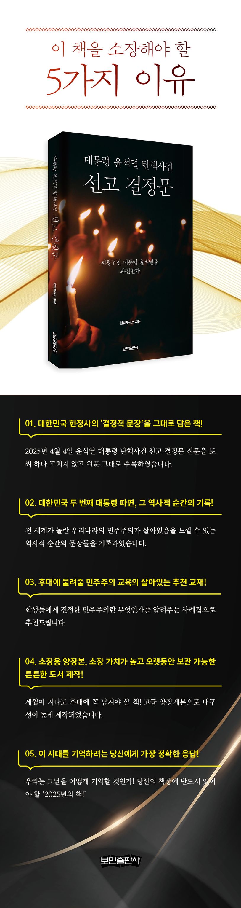 우리는 이번 탄핵사건을 통해 비상계엄이 더 이상 추상적 단어가 아닌 현실적 공포였음을 깨닫게 되었다. 무엇보다도 후대에게 물려줄 단 한 권의 책이 있다면 바로 이것이다. 이 책을 통해 상실의 시대에 살고 있는 우리들에게 이번 선고 결정문이 남긴 정의의 언어를 기억해야 할 것이다.