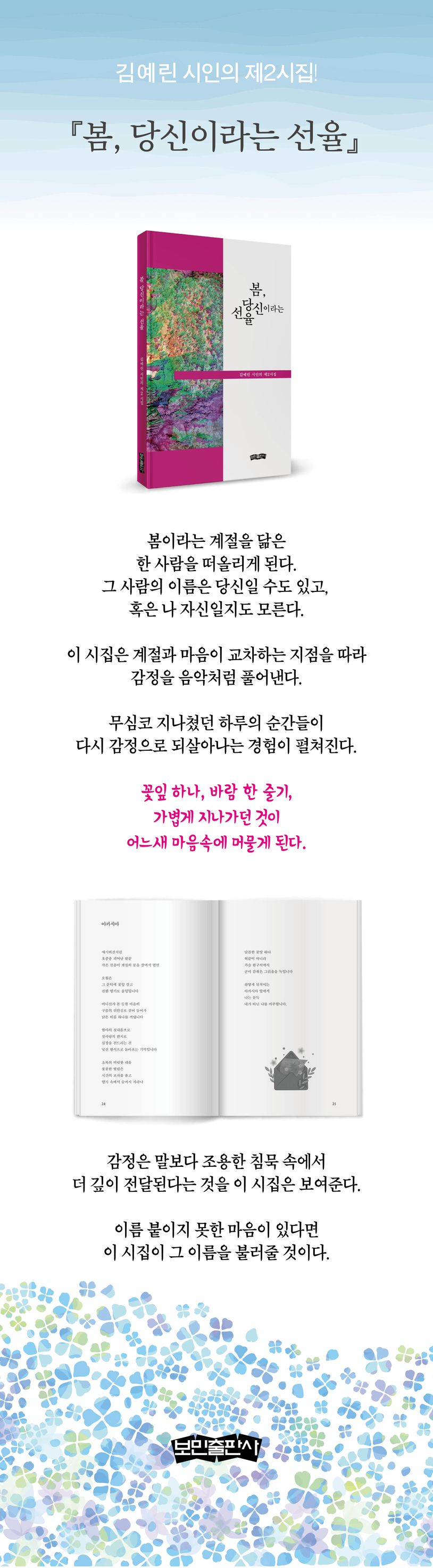 당신이라는 이름을 지닌 봄이 있다. 계절의 결처럼 살며시 다가오는 이 시집은, 김예린 시인이 마음의 결을 따라 길어 올린 사랑과 기억의 선율이다. 봄빛에 젖은 그리움과 말없이 견딘 세월, 조용히 내리는 눈물 같은 순간들을 그녀는 시로 포근히 감싸 안는다. 일상의 조각들 속에 숨어 있던 감정의 떨림을 섬세하게 포착한 이 시집은 잊고 있던 내 안의 슬픔과 마주하게 하고, 그 안에서 작게 피어나는 위로를 건넨다. ‘보이지 않는 고통이 가장 순한 향기를 만든다’는 고백처럼, 이 시집은 말하지 않아도 마음을 어루만지는 힘을 지녔다. 그래서 제2시집 『봄, 당신이라는 선율』은 지금 당신이 놓치고 있던 봄의 조각 하나를, 조용히 건네줄 것이다.