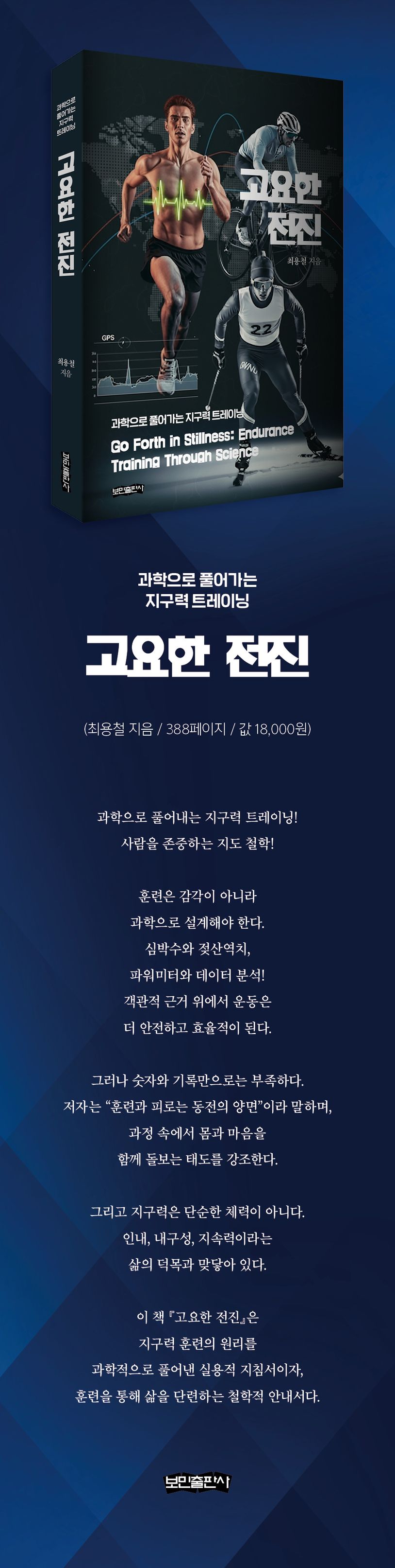 이 책 《고요한 전진》은 운동을 사랑하는 이들에게 단순한 훈련 지침서를 넘어선, 진정한 의미의 교본이라 부를 만한 책이다. 이 책의 저자 최용철 교수는 선수와 지도자 생활을 두루 경험한 후, 수많은 현장에서 쌓아 올린 경험과 통찰을 바탕으로 훈련의 원리를 체계화했다. 그는 선수 시절 몸으로 부딪치며 깨달은 시행착오, 그리고 지도자로서 제자들을 가르치며 느낀 문제의식 속에서, 한국 체육 현장에 꼭 필요한 “원리와 철학이 있는 훈련 교본”의 필요성을 절감했다고 고백한다. 그래서 이 책은 단순히 더 빨리 달리고, 더 많은 기록을 세우기 위한 비법이 아니라, 자기 몸을 이해하고 존중하며 장기적으로 성장하는 방법을 알려준다.