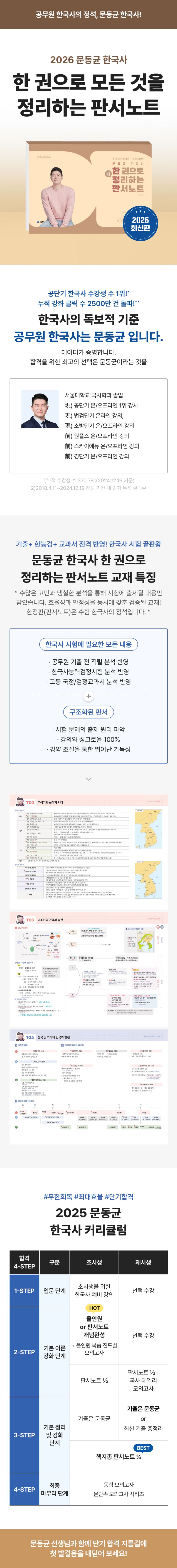 변함없이 공무원 수험 한국사 적중률 1위를 지키며 공무원 수험 한국사의 판도를 바꾸고 있는 『한정판(한 권으로 모든 것을 정리하는 판서노트)』은 문동균 교수님의 강의와 판서 내용, 수험 필수 내용을 한 권으로 집약한 교재로 흐름과 이해, 심화까지 한 번에 정리 · 완성할 수 있도록 구성한 최단기 이론 완성 교재이다. 문동균 교수님의 수많은 고민과 냉철한 분석을 통해 시험에 출제될 내용만 알차게 담아낸, 수험 한국사의 시작부터 끝까지 함께할 최고의 교재이다.