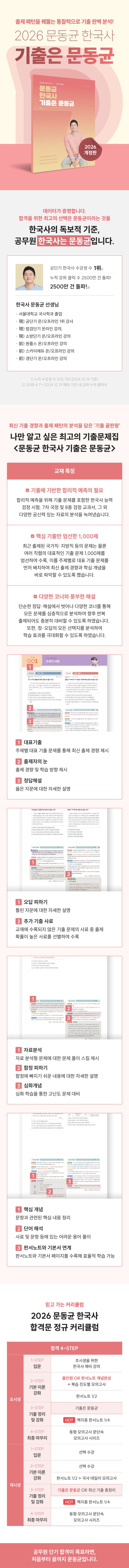 [2026 문동균 한국사 기출은 문동균]은 2025년 최근 시행된 국가직·지방직 등 주요 공무원 시험의 기출 문제와 최신 출제 경향에 따라 핵심 기출만 엄선한 1,000제를 수록한 기출문제집입니다. 주제별로 대표 기출 문제를 먼저 배치하여 최신 출제 경향을 제시하였고, 교재에 수록되지 않은 기출 문제의 사료 중 출제 확률이 높은 사료를 선별하여 수록하였습니다. 또한 단순 해설뿐만 아니라 핵심개념, 심화개념 등 다양한 코너를 통해 모든 문제를 심층적으로 분석하였으며, 정·오답의 모든 선택지를 분석하여 학습 효과를 극대화할 수 있도록 하였습니다.
