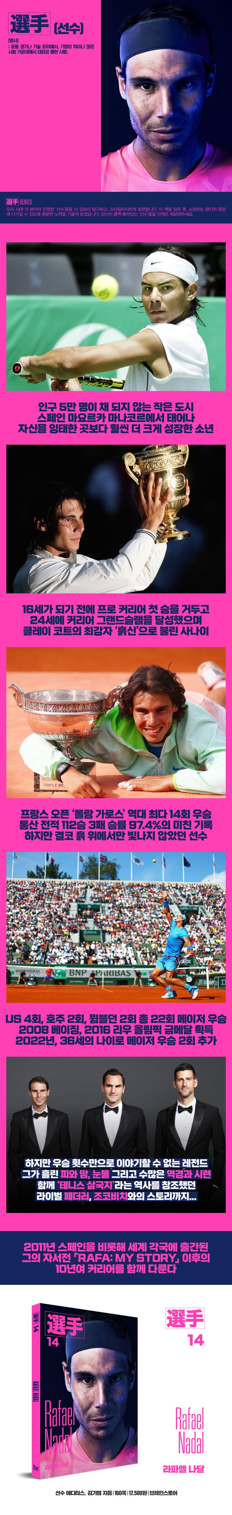 이번에 출간되는 14편에서는 최초로 테니스 종목의 슈퍼스타를 이야기한다. 선수 시리즈 14번째 타이틀의 주인공은 바로 라파엘 나달이다. 테니스는 국내 스포츠 팬들에게는 축구, 야구, 농구, 배구 등의 구기 종목 팀 스포츠만큼 불특정다수가 좋아하는 인기 종목이 아니지만, 세계적으로 봤을 때는 엄청난 팬층을 갖고 있는 글로벌 인기 스포츠이다. 테니스는 전 세계적으로 약 5억 ~ 10억 명의 팬덤을 갖고 있는 것으로 알려져 있으며, 영국 윔블던, 미국 US 오픈, 프랑스 오픈 ‘롤랑 가로스’, 호주 오픈 등의 4대 메이저 대회는 전 세계 200개국 이상 생중계로 방송되는 최고의 스포츠 빅 이벤트들이다.