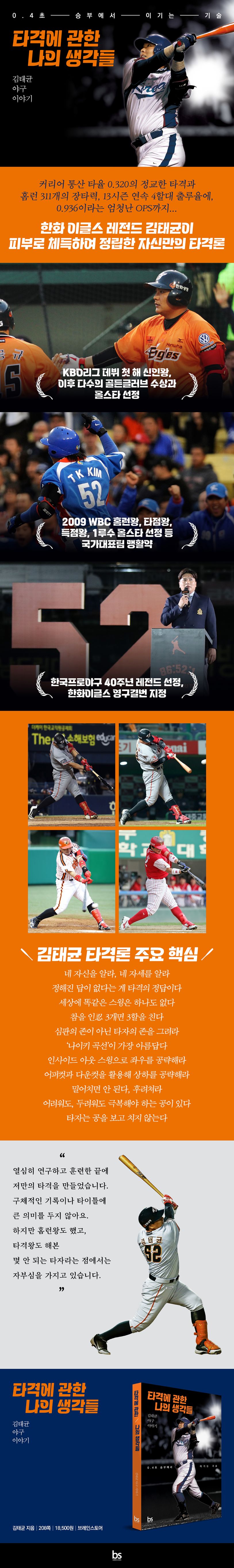 한국 출판 시장 스포츠 분야에서 흔치 않았던 또 하나의 특별한 야구 책이 탄생하는 것이다. 이 책은 흔히 얘기하는 ‘한때 날렸던 스타 선수’의 화려한 성공담으로 수놓은 자전 에세이가 아니다. 굉장히 담백하고 건조하게 야구 그리고 타격에 포커스를 맞춘 전문적이고 깊이 있는 타이틀이다. 김태균이라는 야구인의 프로 커리어 20년, 초중고 아마 시절까지 포함하면 30년이라는 시간 속에서 피, 땀, 눈물과 맞바꿔 얻어낸 타격 노하우와 아이디어가 고스란히 담겨 있는 소중한 책이다.