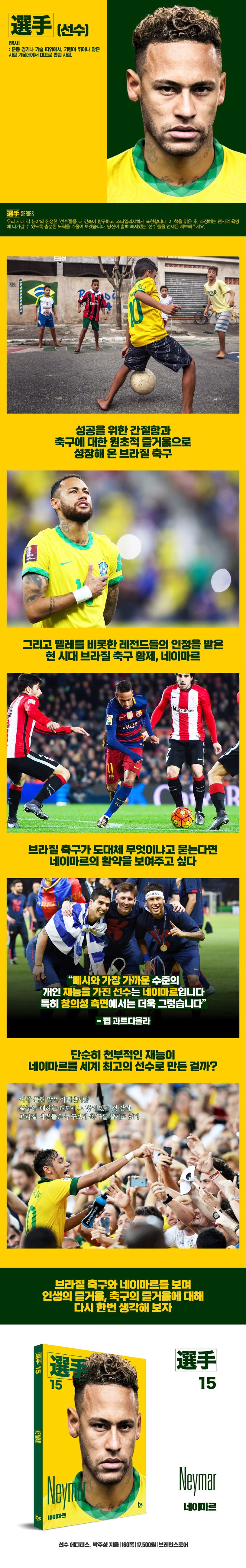 『네이마르 - 선수 15』를 통해 우리가 동경했던 그 시절 브라질 축구 스타들 그리고 브라질 축구가 왜 전 세계적으로 사랑을 받고 있는지 살펴보자. 축구를 사랑하는 사람이라면 브라질을 사랑할 수밖에 없다. 브라질의 영롱한 노란색 유니폼 그리고 브라질의 축구 아이콘 네이마르에 대해 알아 가다 보면, 분명 축구를 더 사랑하게 될 수밖에 없을 것이다.