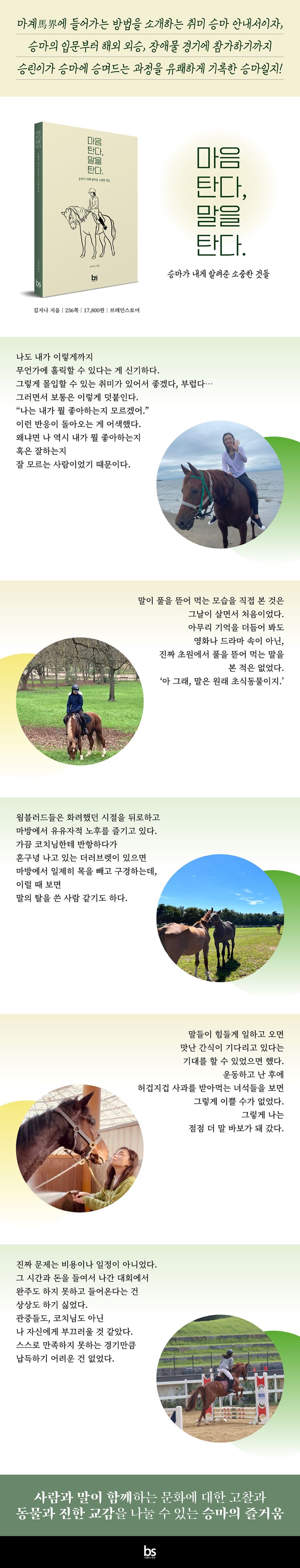 말을 타면 탈수록, 배우면 배울수록 김지나 저자는 많은 책임감을 가지고 말 위에 올라야 한다는 것을 알게 되었다. 그래서 시사저널을 통해 우리나라 최초의 말 칼럼, ‘그런데 말(馬)입니다’를 집필하기 시작했다. 그리고 연단에 서면 자주 승마에 대해 이야기를 꺼냈다. 그동안은 만나는 사람들마다 승마가 얼마나 즐거운지 이야기하느라 바빴지만, 이제는 그 즐거움이 어떤 희생과 노력 위에 만들어지는 것인지 알리고 싶었기 때문이다. 그리고 그 경험과 생각은 『마음 탄다, 말을 탄다』에 한데 묶였다.