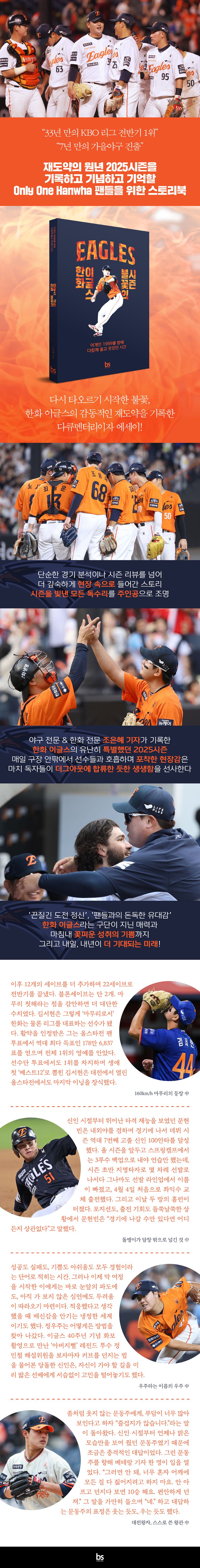 2025시즌 ‘한화 이글스’를 둘러싼 모든 드라마가 한 권에 압축되어 있는 본 도서는, 한화 이글스 팬뿐만 아니라 스포츠를 통한 인간 드라마를 좋아하는 독자들에게 깊은 감동과 울림을 전달할 것이다. 한화 이글스라는 구단이 가진 ‘끈질긴 도전 정신, 팬들과의 돈독한 유대감, 그리고 마침내 꽃피운 성취의 기쁨’이 고스란히 담겨 있어 읽는 이로 하여금 야구라는 스포츠의 진정한 매력을 느끼게 하고 여운 짙은 감동을 안겨 줄 것이다.