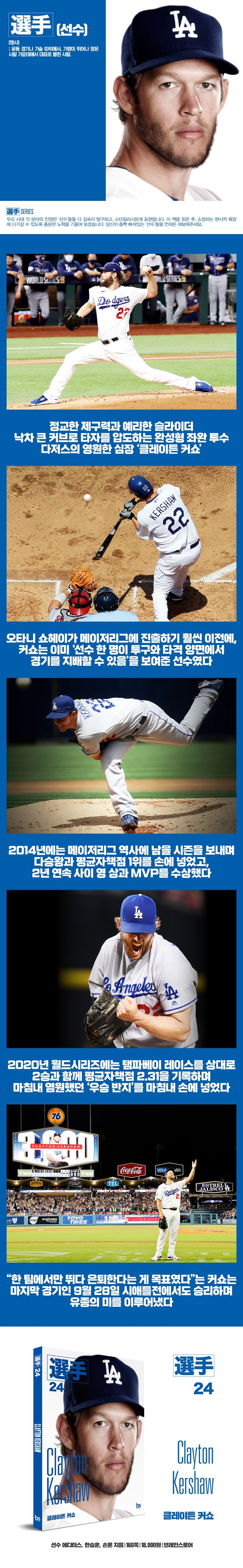 커쇼는 LA 다저스에서 18시즌 동안 활약하며 에이스 투수란 무엇인가를 확실하게 보여주었고, 단순히 개인의 성과를 넘어, 다저스의 전반적인 스타일과 정신을 대표하는 상징적인 역할을 했다. 『선수 24 - 클레이튼 커쇼』에서는 다저스와 함께 20년에 가까운 긴 시간 동안 활약했던 커쇼의 그 시절을 특별한 기억으로 남기고 마지막 시즌, 승리를 거머쥐며 완벽하게 마무리한 그의 모든 커리어를 상세히 전달한다. 야구 전문가 두 저널리스트의 인사이트 넘치는 글과 함께 커쇼와 다저스의 18년 동행을 다채로운 이미지로 전달하는 것도 이 책이 가진 독보적인 매력이라고 할 수 있을 것이다.