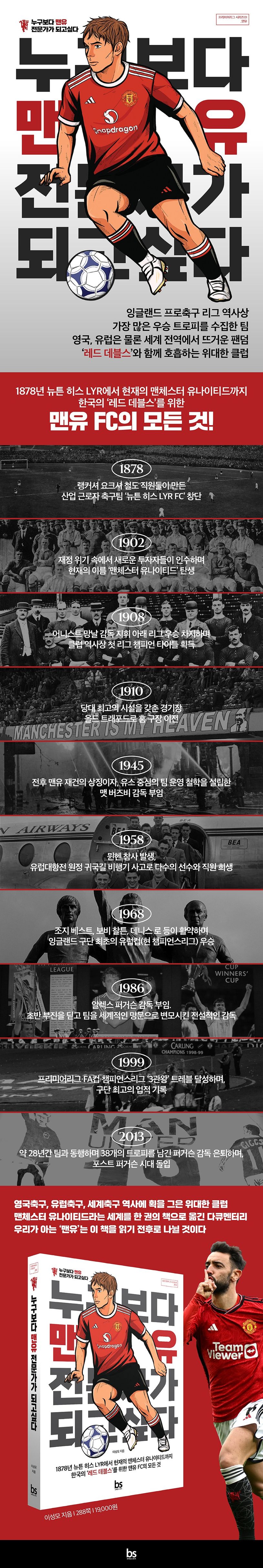 이런 모든 축구팬들을 위해 브레인스토어가 10년 만에 다시 ‘프리미어리그 시리즈’를 새롭게 출간한다. 그 리부트의 첫 번째 주인공은 물론 맨체스터 유나이티드, ‘맨유’다. 안타깝게도 한 시즌, 두 시즌, 힘겨운 시간을 보내는 날들이 늘어나고 있지만, 여전히 가장 많은 팬들의 심장을 뛰게 하고, 빨간색만 봐도 피를 끓어오르게 하는 특별한 무언가가 있다. 맨유는 한국 축구팬들에게 언제나 그런 존재였다.