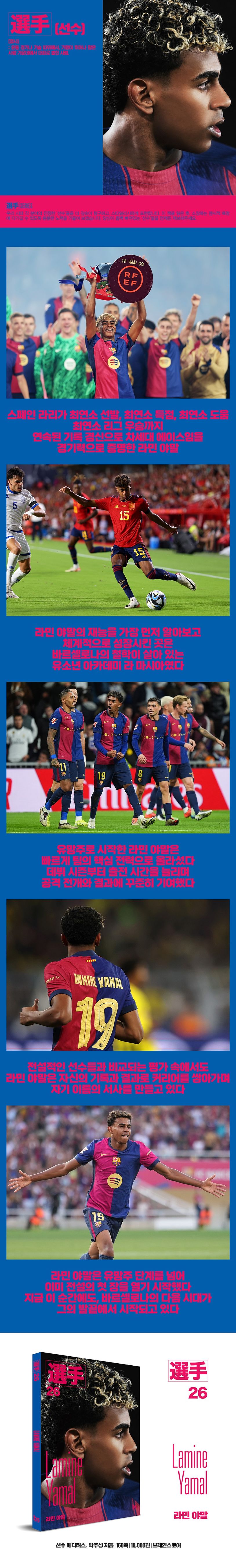 『선수 26 - 라민 야말』은 스페인의 작은 도시에서 자란 소년이 바르셀로나와 스페인의 미래로 거듭나는 모든 과정을 세밀하게 담아냈다. 또한, 그가 이토록 경이로운 성장을 거둘 수 있었던 배경인 바르셀로나의 유소년 시스템 ‘라 마시아’를 함께 조명하며, 한 명의 스타가 만들어지는 배경까지 깊이 있게 담아낸다. 이 책은 라민 야말이라는 한 천재의 기록을 넘어, 그를 빚어낸 바르셀로나의 축구 철학까지 한 권에 담은 특별한 콘텐츠가 될 것이다.