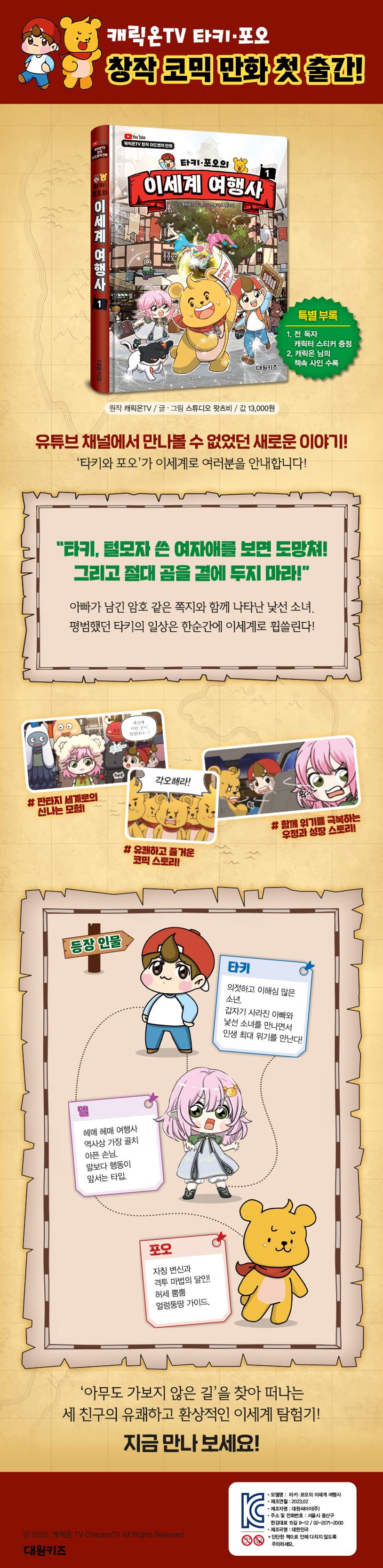 유튜브 채널에서 만나볼 수 없었던 새로운 이야기와 신비한 세상이 펼쳐지는 〈타키 포오의 이세계 여행사〉! 타키와 포오가 안내하는 기상천외한 모험을 따라가다 보면, 나도 몰랐던 탐험심, 도전 정신 UP! 티격태격하면서도 서로를 돕고 이끄는 세 사람의 진~한 우정에 감동! 보너스로 문해력과 창의력도 업그레이드 됩니다.