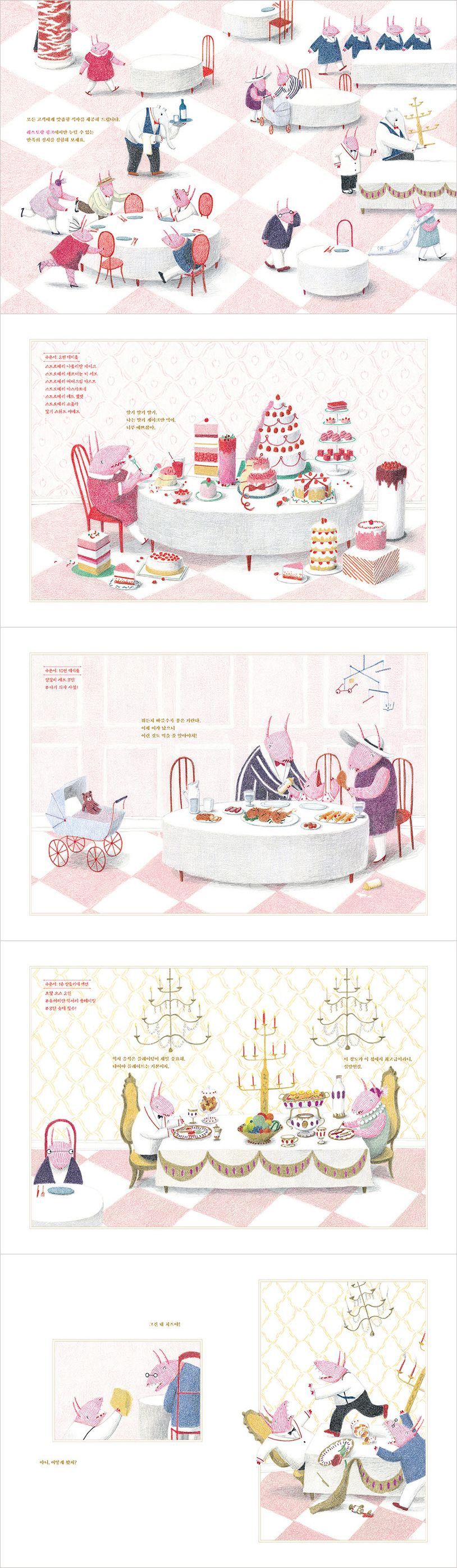 낯선 세상을 자유롭게 경험하는 『문』, 별별 캐릭터들이 어울려 사는 『이상한 집』 등으로 우리 안의 내밀한 심리를 포착하여 초현실의 공간을 그려 낸 이지현 작가가 이번에는 다양한 과욕이 집결된 공간을 만들었습니다. 『레스토랑 핑크』는 이곳의 서비스를 탐닉하는 손님들을 통해 환상과도 같은 욕망에 대하여 생각해 보게 하는 그림책입니다.