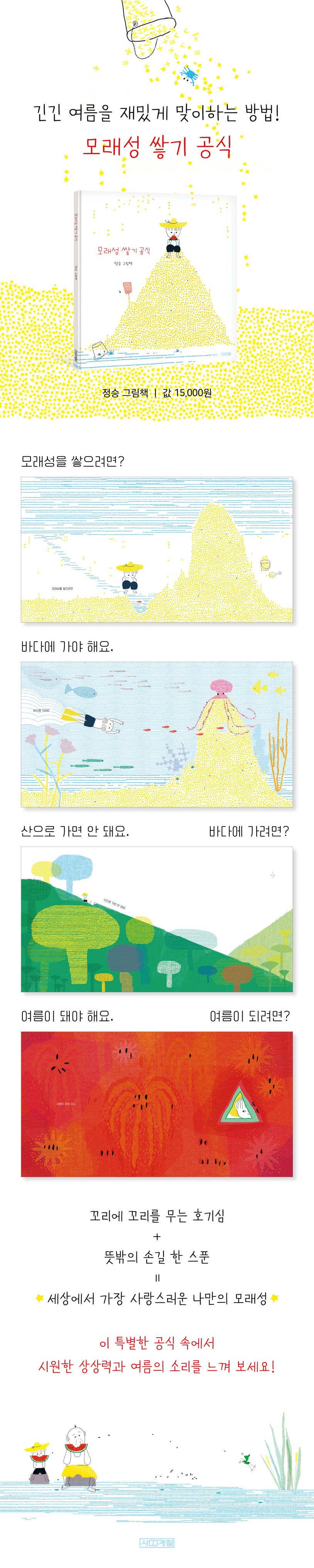 별모양 모래가 가득 펼쳐진 해변, 밀짚모자를 쓴 아이가 모래성 쌓기를 궁리합니다. “모래성을 쌓으려면, 바다에 가야 해요. 산으로 가면 안 돼요.” 처음 세 장면에서부터 어린이의 해맑은 사고방식이 성큼 느껴집니다. 이렇게 모래성을 쌓으려면 뭘 해야 되고 또 그게 되려면 뭘 해야 되는지, 필요한 조건들이 말 잇기 놀이로 이어집니다. 단, 이 모든 것은 평범한 예상을 훌쩍훌쩍 뛰어넘을 것입니다. 『모래성 쌓기 공식』에 모래성을 쌓는 데 실제로 필요한 준비물은 이미 있습니다. 모래성 쌓기를 위해 여름을 즐기고 자연을 살피는 마음을 새롭게 찾고 있지요. 나를 둘러싼 세상을 당연하게 여기지 않고 작은 변화들을 알아봐 주는, 어린이의 순한 마음이 담긴 그림책입니다.