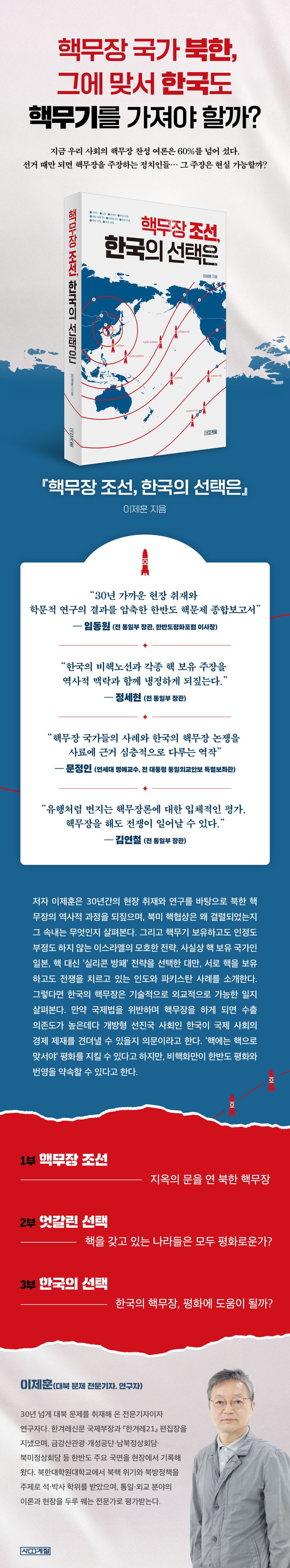 북한은 현재 50기가 넘은 핵탄두를 보유한 핵무장 국가이다. 이에 한국에서도 핵무장 여론이 높다. 한국의 핵무장은 가능한 일이며 한반도 평화에 도움이 될까? 이제훈은 30년 동안 통일·외교·안보 분야를 현장에서 취재해 온 전문 기자이다. 그는 한국의 핵무장 여론을 분석하기 위해 북한의 핵개발 역사와 북미 핵협상의 과정을 살펴본다. 그리고 핵무기를 보유하고도 인정도 부정도 하지 않는 이스라엘의 ‘모호한 전략’, ‘사실상 핵 보유 국가’인 일본, 핵 대신 ‘실리콘 방패’ 전략을 선택한 대만, 서로 핵을 보유하고도 전쟁을 치르고 있는 인도와 파키스탄 등 다양한 사례를 소개한다. 한국이 핵무장을 하려면 국제법을 위반해야 하며, 그 순간 국제 사회의 경제 제재를 받게 된다. 수출 의존도가 높은 개방형 통상 국가인 한국이 북한이 지금 겪고 있는 고통을 똑같이 감내할 수 있을까? 그것도 매번 선거를 통해 정권이 바뀌는 민주주의 정치체제에서 말이다. 핵무장론자들은 ‘핵에는 핵으로 맞서야’ 평화를 지킬 수 있다고 한다. 하지만 저자는 한국의 핵무장은 불가능한 일이며 한반도 평화·공존·번영을 약속할 수 있는 유일한 길은 ‘비핵화’라고 말한다.