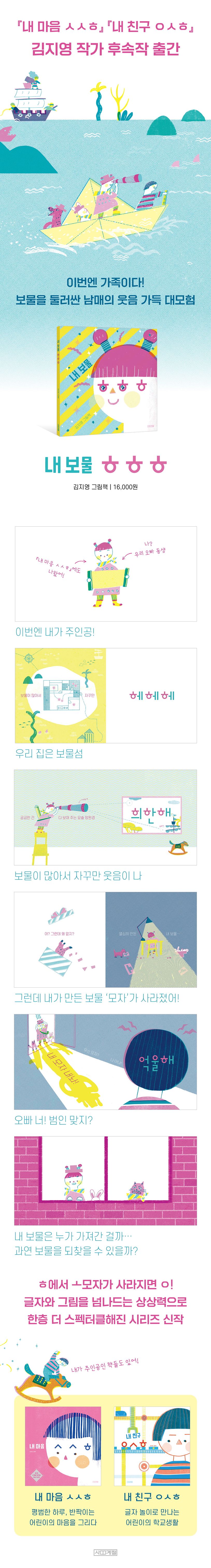 재미있는 글자 놀이로, 어린이의 다채로운 마음을 풀어낸 『내 마음 ㅅㅅㅎ』 복잡 미묘한 친구 관계와 학교생활을 그린 『내 친구 ㅇㅅㅎ』에 이은 신작이 2년 만에 출간되었습니다. 한글의 매력을 한껏 살린 콘셉트로 주목을 받으며, 첫 작품이 초등 2학년 1학기 국어활동 교과서에 수록되는 등 어린이부터 어른까지 큰 사랑을 받아 온 시리즈의 세 번째 작품입니다. 『내 보물 ㅎㅎㅎ』은 남매간의 우애와 가족의 소중함을, 웃음을 머금은 자음 ‘ㅎㅎㅎ’으로 그려 냅니다.