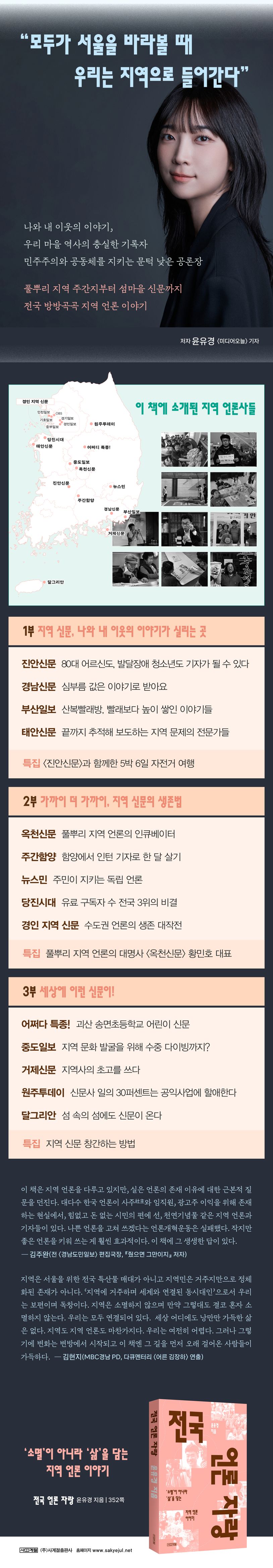 최근 한국 사회는 민주주의의 위기를 겪으며 언론의 역할을 다시금 주목하게 되었다. 미디어 비평 전문지 〈미디어오늘〉의 윤유경 기자가 쓴 이 책은 권력을 감시하고, 시민의 알 권리를 보장하며, 누구나 참여할 수 있는 건강한 공론장을 형성하는 언론 본연의 역할을 가장 충실히 수행하고 있는 지역 언론사 19곳을 취재한 결과물이다. 지역의 노년 여성들과 발달장애 학생들에게 글쓰기를 가르쳐 직접 기사를 쓰게 하는 〈진안신문〉, 노인들만 남은 마을에 빨래방을 열어 세탁비 대신 이야기를 받아 기사화한 〈부산일보〉, 지역에서 한 달 살기와 인턴 기자 프로그램을 결합해 청년층의 관심을 모은 〈주간함양〉 등 이 책은 주민 한 사람 한 사람의 목소리에 귀 기울이고, 그들이 겪는 어려움을 함께 해결해나가며, 그 과정을 지역의 역사로서 기록하는 지역 언론의 참신한 아이디어와 놀라운 헌신을 소개한다.